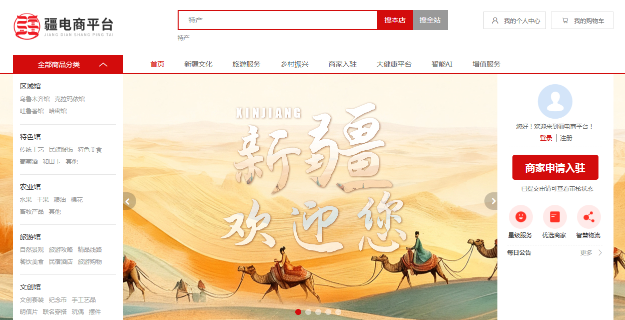 疆电商平台作为整合型区域电商平台,主营新疆特产、新疆农业、新疆旅游、新疆文创等产品,以“共性打底、差异突围、优势赋能”的定位,构建起连接地方产业、商家与消费者的价值桥梁,成为助力区域经济、助力商家低成本获客转型的优选平台。